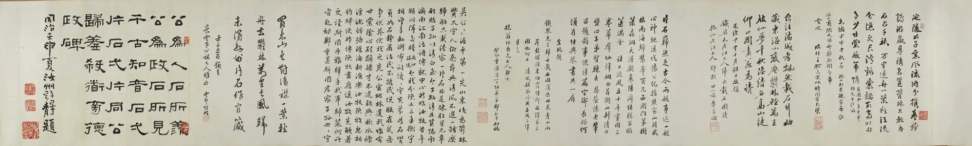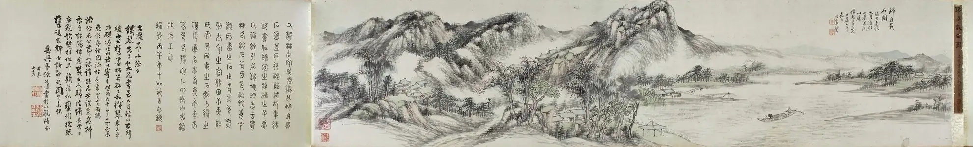 书法与题跋:画卷上布满了书法题跋,字体涵盖楷书、行书等多种,书法风格各异,或端庄规整,或流畅洒脱。题跋内容丰富多样,有的是对画作意境的解读,有的是作者的创作缘由阐述,还有的是后世收藏者或文人对画作的评价等,为研究这幅作品提供了丰富的文字资料,也丰富了作品的文化内涵。