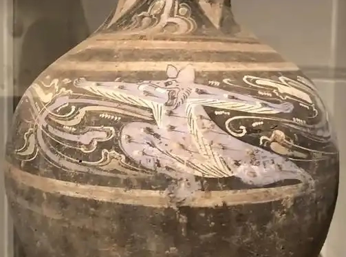 这件西汉彩绘陶壶造型古朴端庄,壶身较为圆润饱满,上部有一个短颈,顶部带有壶盖。陶壶表面采用彩绘工艺进行装饰,色彩虽历经岁月有所剥落,但仍能看出主体图案。壶身绘制有灵动的动物形象,可能是神话传说中的瑞兽,其身姿矫健,周围辅以流畅的云气纹等线条图案,使得整个画面富有动感和神秘色彩。纹饰线条流畅自然,体现了当时工匠较高的绘画技艺,也展现了西汉时期独特的艺术风格。