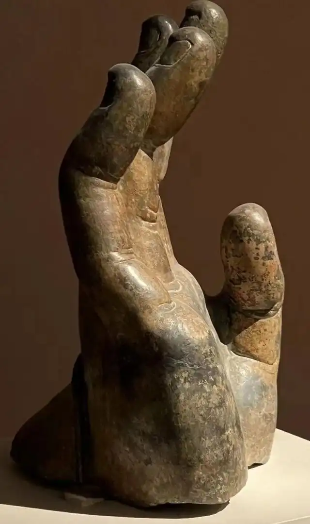 细节:手指的雕刻极为细腻,关节的起伏、皮肤的纹理都清晰可见,展现出工匠对人体手部结构的精准把握。掌心的纹路雕刻也十分逼真,仿佛有着真实的触感。指甲圆润且修长,边缘处的雕刻精致, 整体细节处理精湛,充分体现了北齐时期高超的石雕技艺。