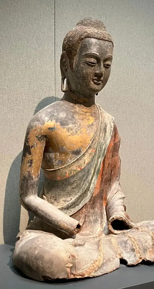 材质与色泽:以夹纻工艺制成,胎体轻盈且坚固。表面的漆层历经岁月,虽有部分剥落,但仍能看出曾经的绚丽。原本的彩绘色彩丰富,如肌肤处可能为肉色,袈裟处有多种颜色,虽已斑驳,但仍能分辨出红、绿等色彩。涂金部分也有磨损,不过在一些凸起和关键部位,仍闪烁着金色光芒,为佛像增添了华贵庄严的气质。