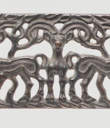 采用汉代成熟的 “镂空透雕”(又称 “镂雕”“透雕”),先在青铜板材上勾勒出羊纹轮廓,再通过錾刻、镂空、打磨等步骤,去除纹饰外的多余铜料,使羊纹与背景形成 “虚实相生” 的立体效果 —— 羊的身躯、四肢为 “实”,背景的镂空区域为 “虚”,既减轻了带板重量,又让纹饰更显灵动,避免了平面雕刻的单调。部分细节(如羊的毛发、面部)可能辅以 “线刻”,用细劲的阴刻线刻画羊的眼睛、胡须、卷曲的羊毛,线条流畅且富有韵律,体现汉代 “简约而不简单” 的审美取向。