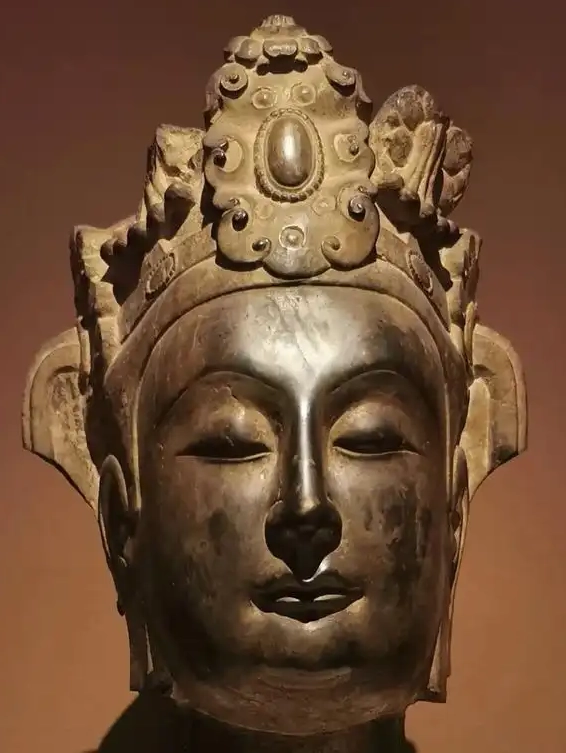 细节:面部雕刻细腻入微,线条流畅自然。眉眼细长且微微低垂,流露出宁静、悲悯的神情,仿佛饱含对众生的慈悲;鼻梁挺直,鼻翼线条柔和;嘴唇小巧,嘴角似带浅浅笑意,给人亲切之感。耳朵造型优美,耳垂圆润。冠饰上雕刻有复杂的花纹、装饰部件,比如圆形的宝石装饰、卷曲的花纹等, 工艺精湛,每一处细节都体现出北齐时期工匠高超的雕刻技艺和对宗教艺术的虔诚态度。