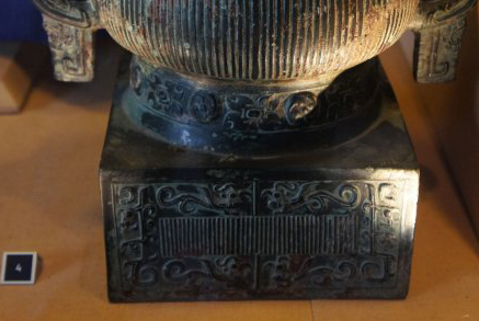 细节:簋身装饰有精美的纹饰,腹部主体为竖条纹,线条流畅且规整,给人一种秩序感;口沿和圈足部位装饰有饕餮纹等兽面纹饰,造型神秘威严,线条刚劲有力。两个兽首形耳雕刻细腻,兽首造型生动,耳部还带有装饰性的珥 。方形底座上也雕刻有复杂的纹饰,线条细腻,图案精美,与簋身的纹饰相呼应,体现出西周时期高超的青铜铸造工艺和艺术审美水平。