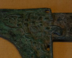 汉代是中国历史上一个强盛的朝代,在军事方面有着完备的军备体系。戈是一种传统的长兵器,在汉代以前就已经广泛使用,虽然在汉代随着骑兵的兴起,戟、矛等兵器逐渐成为战场上的主流,但戈在礼仪活动、车战遗迹一些特定的军事场合仍在使用。同时,汉代的青铜铸造工艺在前代基础上不断发展, 不仅用于制造兵器,还用于制作各种礼器、生活用具等。青铜器物上的纹饰也从商代、西周时期的神秘威严,逐渐向更加流畅、富有动感的风格转变,这件汉戈上的纹饰就是汉代青铜艺术风格的一种体现。