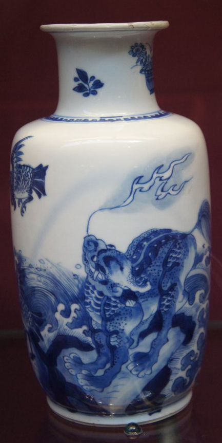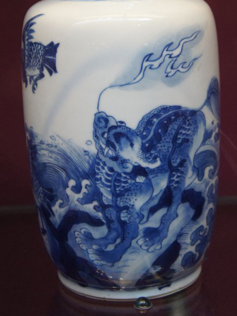 细节:瓶身主体绘有瑞兽在海浪中奔腾的图案,瑞兽造型生动,毛发、鳞片等细节刻画细致,展现出威猛的姿态;海浪线条流畅,翻滚的形态栩栩如生,营造出汹涌澎湃的气势。颈部还点缀有青花花卉纹,简洁而精致,与主体图案相呼应,增添了装饰的丰富性。