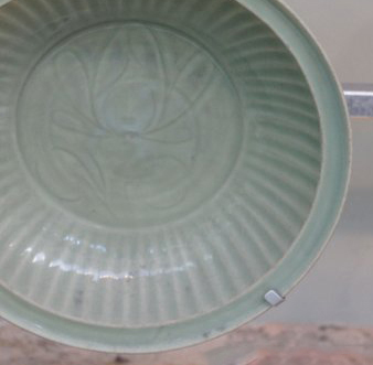 细节:盘内采用刻花工艺装饰,中心位置刻有一朵盛开的莲花图案,莲花线条流畅,花瓣层次分明,展现出莲花的优美形态。盘内还刻有放射状的条纹,从中心向边缘散开,增加了盘面的层次感和装饰性 。刻花处的釉色因釉层堆积和刻痕的原因,呈现出略深的色泽,与周围釉色形成对比,凸显出纹饰的立体感。