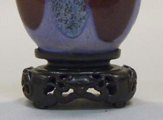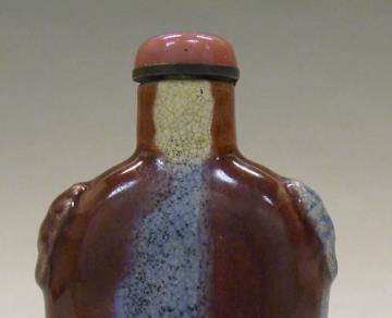 通常为扁瓶形或圆形,高约 3-8 厘米。瓶口较小,多为敛口,配有软木塞及细小的骨勺。壶身两侧肩部位置对称装饰有铺首耳,铺首通常为兽头造型,如狮头、饕餮等,衔环图案源于青铜文化,具有古朴庄重之感。多为景德镇烧制,属于瓷质鼻烟壶。制作工艺复杂,需经过选料、制坯、施釉、烧制等多个环节,其中窑变釉的烧制难度极高,难以控制其最终的色彩和纹理效果,成品率较低,因此显得尤为珍贵。