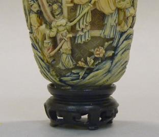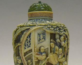 以椭圆形为主高度多在 6-10 厘米之间,宽度 3-5 厘米,厚度 2-3 厘米,符合成人手掌握持尺寸必备 “壶口”“壶颈”“壶腹”“壶盖” 四部分 —— 壶口极小(直径仅 0.5-1 厘米),需搭配 “小勺”(多为象牙或金属制,藏于壶盖内)取用鼻烟;壶颈短而细,部分雕刻弦纹或回纹装饰;壶腹为主要雕刻区域,空间开阔;壶盖多为 “平顶” 或 “圆顶”,部分镶嵌 “碧玺”“珊瑚” 等宝石作为钮,既提升美观度,又方便开启。
