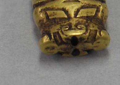 长 3.8 厘米、高 2.3 厘米、最大直径 1.2 厘米,器身呈 “圆柱状弧形”(类似弯曲的龙形饰件)。头部为兽面核心 —— 双目圆凸(似琉璃珠镶嵌,已缺失),双角向上向内卷收(角上刻有细条纹),宽卷鼻(鼻孔清晰),龙尾横断面平齐,整体造型小巧精致,推测为组佩或车马饰的一部分。