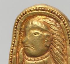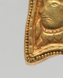 整体呈长条形,前宽后窄,周缘有钉孔,可能是剑鞘的装饰。金饰片上的人物穿着吐蕃翻领袍,束发额带,后飘绶带吐蕃的金饰工艺以其美观、珍奇以及精良的工艺著称于世