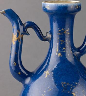 康熙洒蓝釉描金酒壶的器型多样,常见的有执壶和提梁壶等。执壶通常器型纤长秀丽,有弯曲的流和把手,壶盖完整,整体比例和谐优美。提梁壶则有弯曲的提梁,方便提拿,如清康熙洒蓝釉描金东坡夜游图提梁壶,壶腹两面开光,一面金彩绘东坡夜游赤壁图,另一面书七言律诗一首,具有较高的艺术价值。