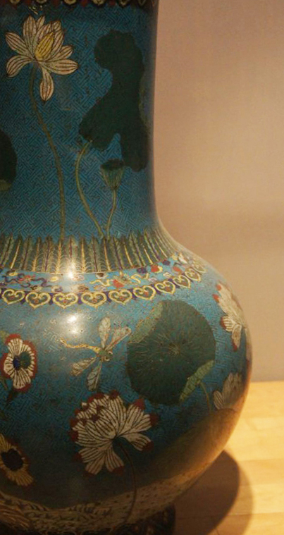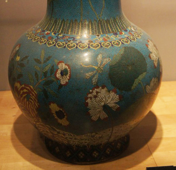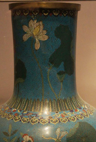 细节:运用掐丝工艺,以金丝或铜丝勾勒出荷花、荷叶、花卉以及蜻蜓等图案的轮廓。荷花花瓣层次分明,荷叶叶脉清晰,花卉形态逼真,蜻蜓栩栩如生,展现出工匠高超的技艺。瓶口、颈部和瓶底边缘处装饰有精美的花纹,如回纹、如意纹等,线条细腻流畅,与主体的花卉图案相得益彰,更增添了器物的华贵之感。