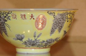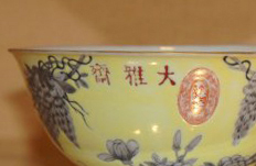 细节:碗身用青花细致地描绘了花卉图案,花朵形态逼真,枝叶舒展自然,线条流畅细腻,展现了工匠高超的绘画技艺。“大雅斋” 三字以楷书题写于碗身,字体工整有力。红彩印章样式的装饰,色彩鲜艳,与黄釉和青花形成对比,使整个碗的装饰更加丰富和美观。