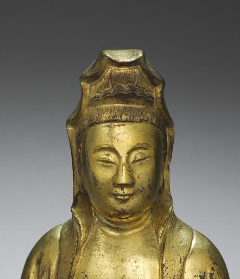 本品规格为17.6厘米。观音呈 “自在坐”(游戏坐 ),左腿曲盘、右腿下垂,右手搭于右膝,左手撑地,姿态闲适洒脱,突破传统佛造像的庄严拘谨,体现北宋造像对 “自在” 神韵的追求,契合文人雅士审美与宗教世俗化趋势。以铜为胎,通体鎏金(虽有部分剥落,仍显华贵 )。头戴宝冠,冠型简洁;面部线条柔和,眉眼低垂、嘴角微扬,流露慈悲宁静;衣饰刻画细腻,袈裟褶皱自然,胸前系带、袖口纹饰清晰,尽显北宋造像工艺精湛。