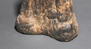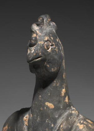 本品规格为22.6厘米。头部为鸡首造型,鸡冠、喙部、眼部特征可辨(如鸡冠隆起、尖喙形态),虽细节因风化简化,仍保留鸡的生动神韵(如 “昂首” 姿态)。人身着宽袖长袍,衣纹以简练线条刻划,呈现自然垂坠褶皱;双臂交叉抱于身前,姿态端庄肃穆,契合北魏俑类 “仪仗守护” 的功能性风格,传递古朴仪式感。