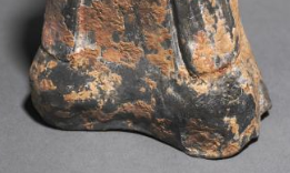本品规格为22.6厘米。头部为牛首,双耳自然下垂,双目圆睁,眼神温和中透着坚毅,牛鼻宽大,嘴角微微上扬,展现出牛温顺又憨厚的神态,虽历经时光磨损,牛的特征依旧鲜明 。身着宽大长袍,衣纹以简洁流畅的线条刻画,呈现出自然的褶皱与垂坠感,双臂交叉抱于胸前,姿态端庄肃穆,带有北魏时期俑类典型的庄重、守护风格 。
