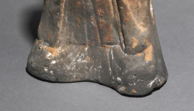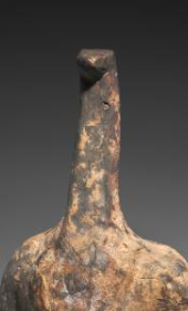 本品规格为22.6 厘米。头部为蛇首形态,蛇首细长,向上伸展,虽因岁月侵蚀细节有所模糊,但仍可看出蛇类蜿蜒、修长的特征,保留着蛇的神秘与灵动 。人身穿着长袍,衣袍线条简洁,刻画出自然的褶皱纹理,双臂交叉抱于身前,姿态端庄肃穆,契合北魏时期俑类作为墓葬仪仗、守护器物的风格,展现出一种古朴的仪式感 。