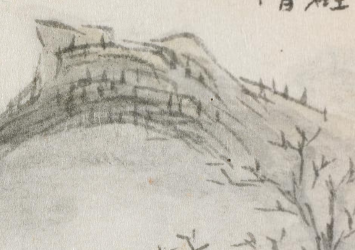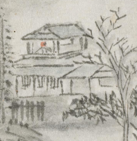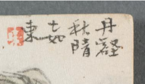 本品规格为6.1 x 7.7 厘米。以水墨绘丹崖秋景, 近岸树木萧疏, 屋舍错落; 中景山峦层叠, 丹崖挺秀; 远景江天开阔, 孤舟悠然。 用笔简淡, 以皴擦写山石肌理, 以点线绘草木屋舍, 淡墨晕染间, 营造出 “丹崖秋晴、 江村静穆” 的清幽意境, 传递清代文人对秋日山水的闲适观照。