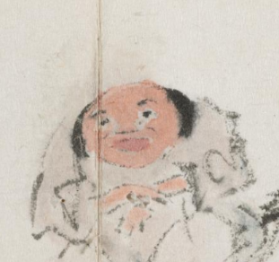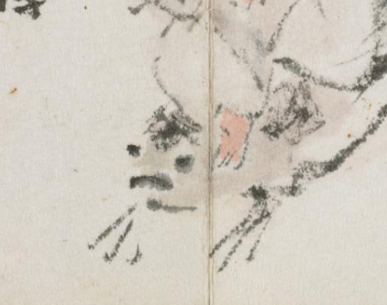 本品规格为6.1 x 7.7 厘米。以简笔淡墨绘刘海形象, 孩童面容、 神态俏皮, 衣袂简约, 身旁似有蟾蜍(神话中 “戏蟾” 元素 )。 笔墨率性, 以线条勾勒身形, 淡彩点染面部, 寥寥数笔便将神话人物的活泼灵动与童真特质刻画生动, 传递出 “刘海戏蟾” 典故的奇幻趣味。
