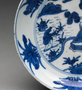 般为撇口、弧腹、圈足的经典盘式,造型规整,线条流畅,比例协调,具有明代瓷器端庄稳重的风格。其尺寸大小不一美国大都会博物馆收藏的一件明万历青花周敦颐爱莲图盘,直径约为 11.9 厘米。胎质坚硬细腻,经过精细淘洗,胎体厚重适中。釉面光亮莹润,白中微微泛青,给人以温润之感,展现了万历时期瓷器釉质的特点。