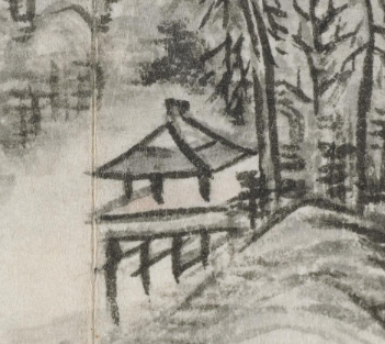 本品规格为6.1 x 7.7 厘米。以水墨绘山水, 近景亭阁临溪, 树木错落; 中景山峦层叠, 云雾轻笼; 远景岫岩悠远, 江面空蒙。 用笔简淡, 以皴擦写山石肌理, 以点线绘草木屋舍, 淡墨晕染间, 营造出 “山亭观远岫, 江阔意无穷” 的清幽意境, 传递清代文人寄情山水的闲适与哲思。