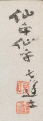 本品规格为6.1 x 7.7 厘米。以简笔淡墨绘仙翁仙子, 仙子持扇轻拂, 姿态灵动; 仙翁憨态可掬, 倚坐于地, 身旁葫芦、 器物点缀, 营造出 “仙侣嬉戏、 随性自在” 的氛围。 笔墨率意, 却将人物神态、 互动刻画得生动鲜活。右侧 “仙翁仙子 七道士” 题识, 点明主题与作者(曾衍东号七道士 ), 书法与绘画相融, 强化 “仙逸奇趣” 风格, 展现曾衍东 “诗书画一体、 以笔写幻” 的创作特色。