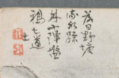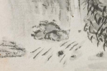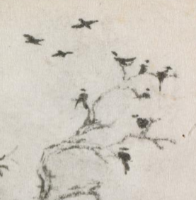 本品规格为6.1 x 7.7 厘米。以水墨绘野渡之景, 瀑布流泉、 山石错落, 枯枝上飞禽栖息、 翔集, 布局疏密有致。 用笔简劲洒脱, 以皴擦写山石肌理, 以点线绘草木禽鸟, 淡墨晕染间, 营造出 “落日野渡、 禽鸟自得” 的清幽意境, 传递清代文人对自然野趣的向往。