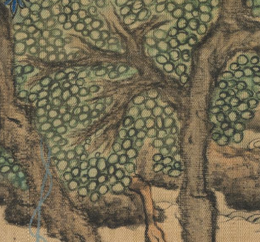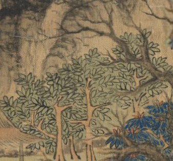 本品规格为30.2 x 26.7 厘米。奇石嶙峋、古树参天(枝干苍劲,树叶以青绿晕染)、溪水潺潺,山峦与植被层次分明,尽显自然野趣。画面中人物姿态闲适,或坐或立,似在雅集、品茗或论道;建筑(如茅屋)与自然景致相融,传递出文人“寄情山水、追求雅致”的生活意趣。
