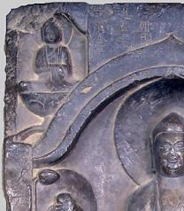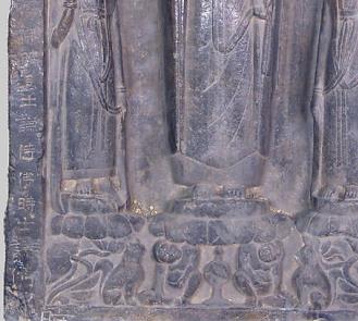仿品多以北齐佛教造像碑的经典形制为蓝本,通常为长方形碑体(少数为尖首碑或圆首碑),由 “碑首、碑身、碑座” 三部分构成,部分石碑保留碑侧装饰,整体比例趋近北齐原作,但细节处常带晚清民国工艺特征核心区域为 “一佛二菩萨” 造像组合,是仿作的重点。碑身两侧或刻立柱(仿北齐 “火焰纹柱” 或 “忍冬纹柱”),柱间常补刻供养人、飞天或题记(部分题记刻意模仿北齐隶书风格,但笔法生硬,缺乏北齐书法的古朴稚拙)。