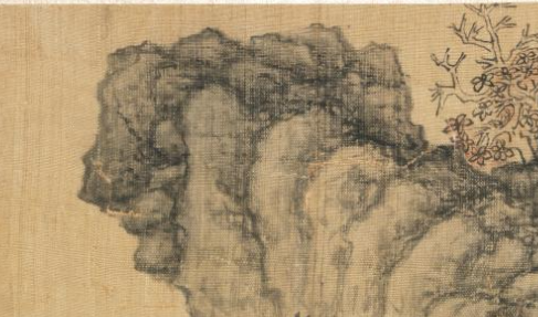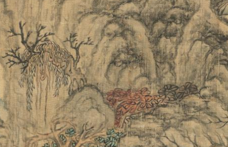 本品规格为30.2 x 26.7 厘米。山石以“披麻皴”表现肌理,堆叠错落间营造险峻气势;树木枝干虬曲,叶色以淡彩晕染,秋意盎然;远景山水朦胧,与近景形成“远近虚实”层次。线条刚劲流畅,勾勒山石、树木时精准传神;设色淡雅清丽,既保留水墨韵味,又以轻彩点染增添生机。