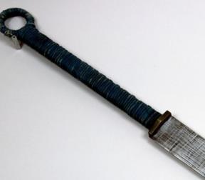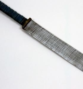 刃部呈 “宽背薄刃” 的狭长弧形,前端略收窄(部分为直刃),刃最宽处约 5-8 厘米,背厚 1-1.5 厘米,兼具劈砍的锋利度与抗弯折的强度;刀身近柄处(“刀镡” 附近)常铸有 “血槽”(1-2 条,深 0.3-0.5 厘米),既减轻重量,又可在劈砍时放出血液、减少阻力。刀柄:多为木质(紫檀、花梨或普通硬木),外层缠裹 “鲛鱼皮”(或牛皮)以增加握持摩擦力,部分宫廷御用或仪仗用刀的刀柄会包镶银、铜饰件,甚至嵌绿松石、珊瑚;刀柄末端装有 “铁镦”(圆形或方形,重约 200-300 克),既平衡刀身重量,又可在近战中砸击敌人。