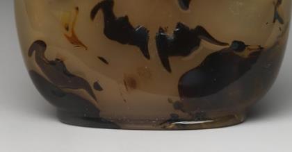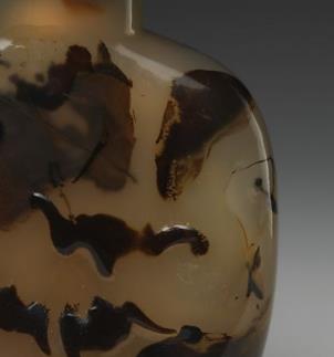 器物主体多采用天然玛瑙,颜色以红、黄、白、褐、灰等色系为主,部分含天然缠丝纹理(玛瑙典型特征)。清代玛瑙原料来源广泛,既有国内辽宁、内蒙古等地的玛瑙矿,也有通过贸易传入的中亚、东南亚玛瑙,质地多细腻温润,透明度从半透到微透不等。