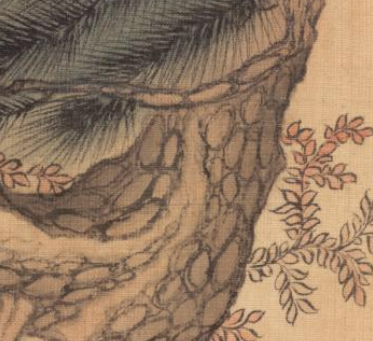 本品规格为30.2 x 26.7 厘米。一位身着宽袍、头戴巾帽的文士,手持拐杖,姿态闲适,尽显隐逸风骨。左侧怪石嶙峋,山石皴法细腻,纹理层次丰富;右侧松枝垂落,针叶以细笔勾勒,枝干遒劲;前景红叶点缀,与山石、松枝共同构建出清幽雅致的自然环境。
