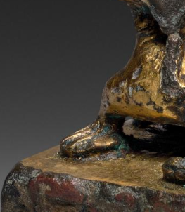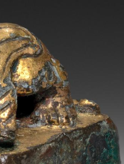 本品规格为1.8 x 1.2 厘米。印体为方形台座,古朴厚重。钮为瑞兽形象,虽历经岁月,兽身鎏金有磨损,但仍可见其形态独特 —— 兽首昂扬,五官雕刻简练却生动,身体蜷卧,四肢敦实,整体造型富有张力,传递出汉代对祥瑞神兽的崇拜与艺术塑造力 。采用铜鎏金工艺,金层与铜胎结合,虽部分剥落,却更显历史沧桑。兽钮的铸造、鎏金的施用,以及印台的打磨,都体现东汉工匠对金属工艺的掌握,从兽身纹理到印台包浆,细节处彰显技艺精湛 。