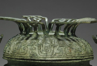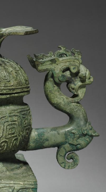 本品规格为34.3 x 44.5 厘米。簋为古代盛食器,此器整体造型庄重规整。由簋身、器盖与方座三部分构成,簋身呈鼓腹状,线条圆润饱满;器盖顶部有造型别致的镂空装饰,增添了器物的灵动性;下方的方座沉稳厚重,与簋身相呼应,使整个器物在视觉上达到平衡,体现出东周时期青铜器在造型设计上对对称、和谐美感的追求 。簋身两侧的龙形耳是显著特色。龙首造型生动,龙角、龙须、龙眼等细节刻画精细,龙身蜿蜒,线条流畅,将龙的威严与灵动展现得淋漓尽致。龙耳不仅是装饰,也方便器物的搬运,体现了实用与美观的结合,反映出东周时期工匠对动物造型的精湛塑造能力和艺术创造力 。