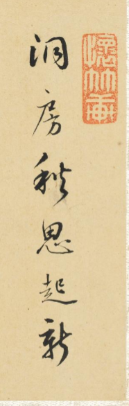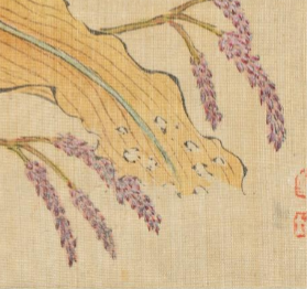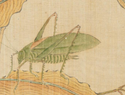 本品规格为12.6 x 17.3 厘米。右侧画面里, 枯黄叶片与紫色小花交织, 一只绿色草虫伏于叶上, 身旁小虫飞舞, 细腻笔触勾勒出草虫形态、 花叶纹理, 色彩淡雅却鲜活, 营造出自然生机与闲适氛围。左侧题诗 “洞房秋思起新凉……” ,以 “秋思” “清风” 等词, 从文学维度呼应画面意境, 诗画一体, 传递出清代文人对自然小景的细腻观察与诗意联想, 让草虫花叶的微观世界, 承载起悠远的文化情思。