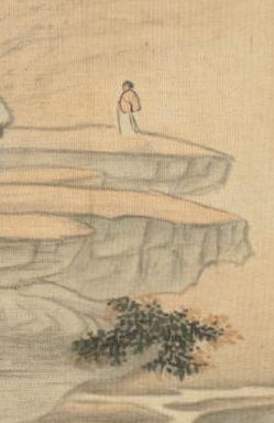 本品规格为12.6 x 17.3 厘米。近景处,岩石嶙峋,几株树木顽强生长,枝叶稀疏却尽显坚韧 ;中景处,地势平缓,一位身着红衣的行人独立崖边,身形渺小却为画面增添了灵动与人文气息;远景里,山峦连绵,在淡墨渲染下显得朦胧悠远,展现出空间的纵深感。整个画面营造出宁静、旷远的山水意境。