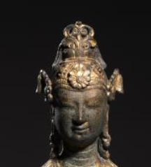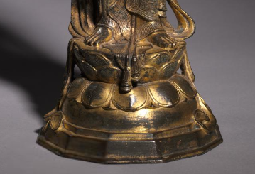 本品规格为43.8 厘米,底座直径14.6 厘米。观音头戴宝冠,冠饰精美,面庞慈祥,五官线条柔和。身披天衣,衣纹流畅自然,璎珞、佩饰细致入微,尽显华贵。右手施无畏印,左手持物(或原持物已失 ),身姿端庄立于莲台之上,莲瓣饱满。虽鎏金有剥落,仍难掩古朴庄严,融合契丹民族风格与中原佛教造像传统,是研究辽代宗教艺术、工艺水平的珍贵实物,传递着千年的信仰与审美。