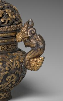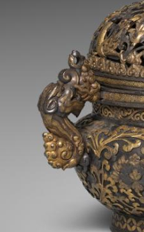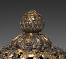本品规格为16.5 x 15.2 厘米。分炉身、炉盖两部分,配对称龙形耳,底设圈足。炉盖隆起,顶端饰莲瓣纹钮,层次分明;炉身圆腹,线条饱满,龙耳立体张扬,兼具实用与装饰性。盖部:透雕云龙,龙身盘绕,鳞片、爪牙精细,云纹穿插其间,点燃香料后,烟气可从镂空处溢出,形成 “龙游云雾” 视觉效果。腹部:浮雕缠枝牡丹,花叶卷曲流畅,鎏金与铜胎底色交错,显富贵华丽;圈足饰几何纹,呼应整体纹饰节奏。