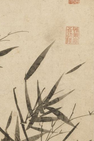 本品规格为94.5 x 30.5 厘米。画中墨竹以简洁而有力的笔触绘就,竹叶形态各异,或舒展、或卷曲,通过浓淡不同的墨色,表现出竹叶的层次与立体感。竹枝挺拔劲健, 从画面下方斜出,展现出竹子的坚韧与生机,仿佛能感受到微风拂过,竹叶沙沙作响的动态。画家以墨写竹,遵循传统文人画 “以形写神” 原则, 不追求形似,更注重传达竹子的神韵与气节,体现出明代文人对高尚品格的追求。