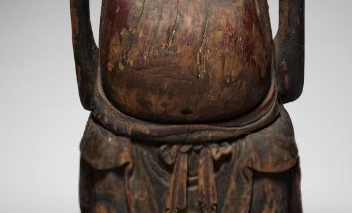本品规格为68 厘米。以木材为质,历经岁月,包浆古朴厚重。弥勒形象鲜明,袒胸露腹,大肚浑圆,笑容可掬,双颊饱满,神态慈祥喜乐。双臂高举,衣袍垂坠自然,褶皱流畅,尽显工匠对衣饰纹理的细腻把握。整体造型生动,将弥勒佛的豁达、欢喜之态完美呈现,是研究明代木雕艺术、佛教造像文化的珍贵实物,承载明代工匠的技艺与对弥勒形象的诠释 。