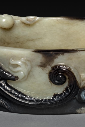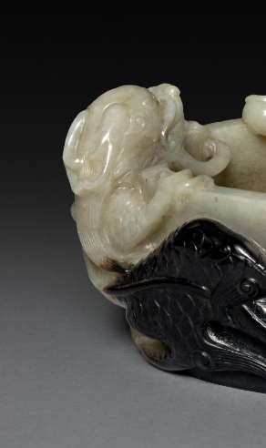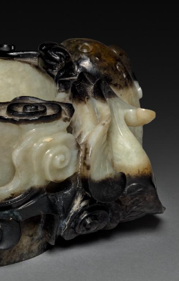 本品规格为4.5 厘米。以玉为材,色泽温润,黑白沁色自然交融。整体呈椭圆笔洗形态,一侧雕琢瑞兽,造型生动,神态灵动,似守护之姿;另一侧及周身饰云龙纹,龙身矫健,云纹飘逸,线条流畅且富有张力。雕刻工艺精湛,瑞兽的毛发、云龙的鳞片等细节入微,利用玉质天然色泽巧作装饰,将瑞兽的灵动与云龙的威严完美融合,既具文房用具的实用功能,又为艺术珍品,见证明代玉雕对祥瑞题材的诠释与高超技艺,承载明代艺术审美与文化寓意 。