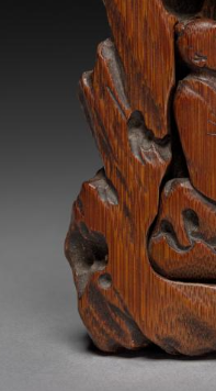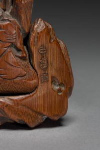 本品规格为9.5厘米。以竹为材,雕刻出山石、松树与高士的组合。山石形态奇崛,镂空雕刻增添层次感,松树苍劲,松针细致,高士端坐于山间,姿态悠然,整体造型营造出静谧的山林意境,生动呈现文人向往的隐居场景。运用浮雕、透雕等竹雕技法。山石的纹理、松树的枝叶,通过雕刻刀细腻呈现,高士的衣纹褶皱流畅自然,“中懒” 款识点明作者或工坊,工艺精湛,展现明代竹雕工匠对细节与意境的把控。
