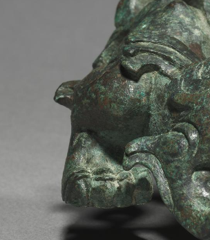 本品规格为6.7 x 7 厘米。以青铜为质,历经岁月呈现古朴绿锈。瑞兽呈蹲踞姿态,身体敦实,肌肉线条隐现于青铜斑驳间。首似狮虎,大耳斜出,双目圆睁,阔口大张,露出獠牙,神态威严又带几分神秘。身侧有翼饰,虽简化却添灵动,四肢粗壮,利爪撑地,足下有短柱,应是用于固定镇物。整体造型融合神兽特征,兼具威慑与祈福之意。