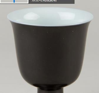 高 9 厘米,口径 7 厘米,足径 5.9 厘米。杯撇口,深腹,空心高圈足,整体造型线条流畅,简洁大方,既具有实用性,又富有艺术美感。杯里施白釉,外施黑釉,黑釉为光润透明、色黑如漆的高温釉,因釉料主要取自景德镇附近所产的乌金土,故又名 “乌金釉”,以三氧化二铁为呈色剂,配合适量的二氧化锰和氧化钴,生坯挂釉,经高温烧成。