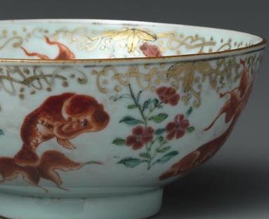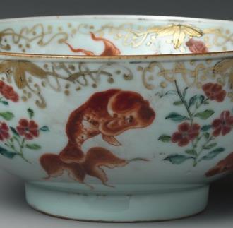 造型为敞口,弧腹,圈足。碗外壁以胭脂红描绘荷花等图案,色彩艳丽,花朵栩栩如生,其间点缀描金金鱼,金鱼形态灵动,金色线条勾勒出鱼的轮廓和鳞片,使其在红色背景的衬托下更加醒目,富有立体感。