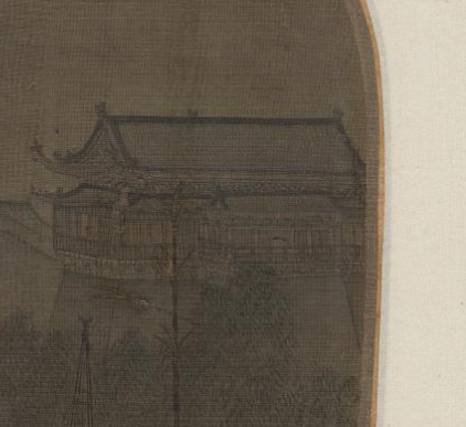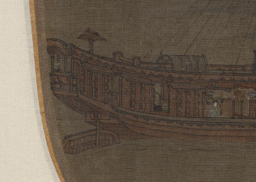 本品规格为25.3 x 19.2 厘米。纨扇形制,画面布局紧凑。以城郭为背景,近景绘泊于岸边的舟船,中景融入山水、建筑, 层次分明,通过虚实、远近对比,营造出开阔又不失细节的空间感, 展现南宋画家对构图的精妙把控。运用细腻的工笔技法, 以淡墨、设色描绘建筑的飞檐斗拱、舟船的结构纹理,线条精准流畅, 虽画面朦胧(因年代久远等可能有褪色、氧化),仍可窥笔墨精致, 体现南宋院体画注重写实、追求细腻的风格。