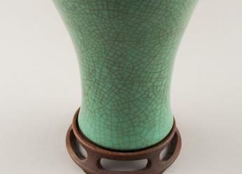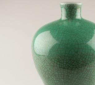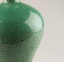 以清康熙郎绿哥釉梅瓶为例,其为酱釉口,短颈,丰肩,敛弧腹,玉璧形圈足。外施绿哥釉,釉层肥厚、莹润,玻璃光感极强,色泽清新淡雅,足边施白釉,无款。釉面呈色浅翠,有玻璃光泽,有的微绿中泛蛤蜊光,器身密布纹片,有 “苍蝇翅” 之称。