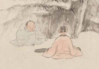 本品规格为11.2 x 13.1 厘米。绘两位文人,一着白衣、一着粉衣,相对而坐于树下。白衣者似聆听,粉衣者正抚琴(琴置于身前 ),姿态闲适,传递 “琴瑟和鸣” 的雅集氛围。以简笔勾勒山石、树木 —— 老树虬枝横斜,枝叶点染淡蓝,增添清逸感;下方坡石、丛草点缀,营造 “林下幽境”,呼应 “山林隐居” 主题。