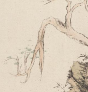 本品规格为11.2 x 13.1 厘米。绘一牧童,戴斗笠、着素衣,骑于牛背,姿态悠然;牛体硕壮,低头缓行,传递 “牧牛归去横牛背” 的闲适。老树虬枝(树干弯曲,枝桠伸展 ),点缀淡绿叶片;坡石、丛竹简笔勾勒,营造 “郊野春景” 氛围,呼应题字 “小雨凉生犊背春”。